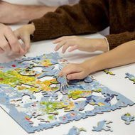 You can play and learn with this puzzle using a lot of engaging mechanics . After assembling you can count all the boats, fishes or penguins. Compare a panda to a polar bear. Detect the surfer and Bigfoot. Discover the Eiffel Tower, the Great Wall of China, or the Colosseum. And collect all the unique-shaped details like animals, fishes, and birds.